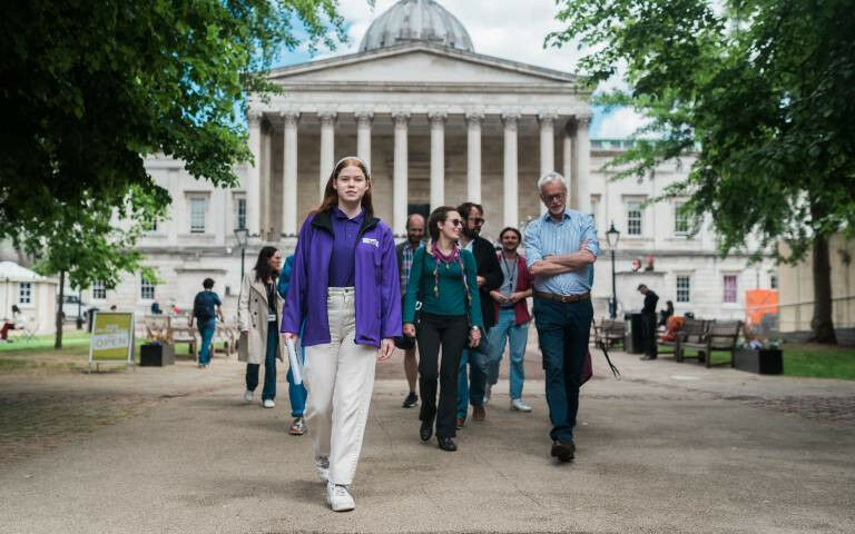 Preview tour starting off in the Quad, with the Wilkins Building in the background - UCL's first ever walking tour will give members of the general public a chance to explore our rich and radical history over two centuries while visiting key sites on campus including Jeremy Bentham's preserved "body", or Auto-icon. The free tour will be delivered by student ambassadors and will run weekly on Fridays from 12:30 to 13:30, starting from 24 June. Student guides will delve into UCL's history - our origins as the first university to admit students regardless of religion, our steps to open up higher education to women on equal terms to men, and our historical links to eugenics - along with the trailblazers and Nobel laureates who have studied here. Among the tour's key sites are the Wilkins Building, used to depict ancient Rome in the film Gladiator ; the Auto-icon of Jeremy Bentham, whose ideas inspired the founding of UCL; a bust of Charles Darwin created by a giant robotic arm; and the Japanese Garden, which celebrates UCL's link to the founders of modern Japan. Kirsty Walker, UCL Vice-President for External Engagement, said: "UCL's first ever public walking tours are every bit as radical and thought-provoking as our rich and radical 200-year history. No other tour takes in sights such as the Wilkins building and preserved Auto-icon of philosopher Jeremy Bentham alongside fascinating stories about Nobel laureates, the founders of modern Japan and a jar of preserved moles.