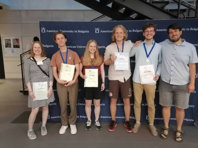 The team of students at Göttingen University who were successful in the 'International Mathematics Competition for University Students'. From left to right: Johanna Kratz, Lennart Finke, Male Hesse, Janek Große, Anton Fehnker with Rok Havlas who helped prepare the team. "Grand First Prize" for Male Hesse - 400 participants in Blagoevgrad, Bulgaria She is the first student from the University of Göttingen to be awarded a -Grand First Prize-: Male Hesse, a mathematics student, won this prize in the individual ranking of the "International Mathematics Competition for University Students" (IMC) in Blagoevgrad, Bulgaria. Also successful were Göttingen University students Lennart Finke (first prize), Anton Fehnker (second prize), Janek Große (third prize) and Johanna Kratz (certificate). In the team evaluation, these students were placed second across the whole of Germany and 13 in Europe. A total of 400 students from all over the world took part in the competition. "We are delighted with our students- wonderful achievements," said Professor Chenchang Zhu at the University of Göttingen's Mathematical Institute, who prepared the students together with Rok Havlas, PhD candidate, University of Göttingen.