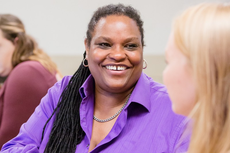 Journalism Janice Collins, advising students in a meeting, said she started Hear My Voice to provide "a platform where we can all come together to learn." Photo by L. Brian Stauffer