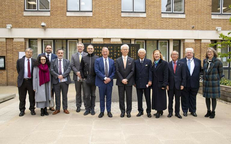 Bouke de Vries, Dr Michael Spence and His Excellency Hajime Hayashi with other guests at the celebration event - This week, UCL welcomed His Excellency Hajime Hayashi, Ambassador of Japan, for the first time for a special event celebrating the university's varied and impactful work with the country. UCL's President & Provost, Dr Michael Spence, introduced Ambassador Hayashi, who spoke of UCL and Japan's "long and outstanding history" and how the two continue working together to enable recovery from natural disasters. The event in UCL's Japanese Garden, which took place just a few weeks after an earthquake hit north-east Japan, saw Dutch artist Bouke de Vries introduce his new public artwork, Fragments of Memory. He explained how he was inspired by both the pioneering work of UCL's cross-disciplinary natural hazards research unit, EPICentre, as well as the history of the famous 'Choshu Five'. EPICentre provides a forum for multidisciplinary research into risk from natural hazards and disaster risk reduction, aiming to drastically reduce loss of life, livelihoods and economic loss in natural disasters. The Choshu Five were the first Japanese students to study abroad, coming to UCL nearly 160 years ago. Upon returning to Japan, the young men - including Hirobumi Ito, Japan's first Prime Minister - had a radical, transformative effect on the country's constitution, government, infrastructure and education system.