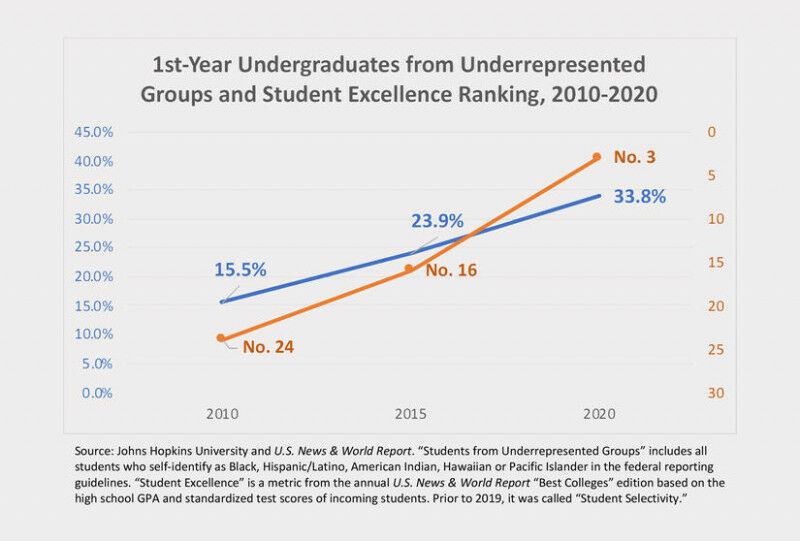 Prior to the Supreme Court decision, Johns Hopkins experienced steady growth in levels of underrepresented students. From 2010 to 2020, the percentage of first-year students self-reporting identities from underrepresented groups rose steadily from 15.5% of the class to 33.8%.