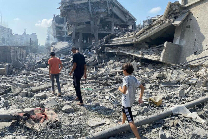 Two adults and a child walk through the rubble of destroyed buildings in Gaza City