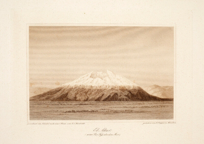 For the second volume, he had planned contributions on the global distribution of temperature, comparative mountain research and volcanism. The collection is supplemented by the pictorial atlas Umrisse von Vulkanen aus den Cordilleren von Quito und Mexiko (1853). It contains twelve plates, including the last drawing by the architect Karl Friedrich Schinkel, a depiction of the Andean volcano El Altar based on a sketch by Humboldt.