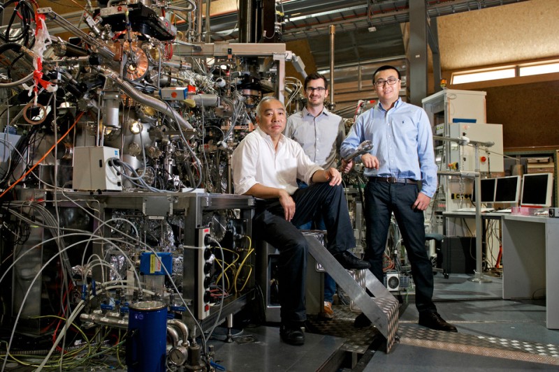 At the SIS beamline at the SLS where the experiments on SmB6 were performed. PSI scientists Ming Shi, Nicholas Plumb and Nan Xu (from left to right). Photo: Paul Scherrer Institute/Markus Fischer