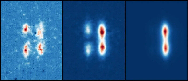 Bosons, by contrast, like to do things together and prefer to all share the same state. Photons are part of this group. If you cool enough of them down and shut them up together in a tiny space, they merge into a kind of gigantic "super-photon." But what if you forced the light particles to take on one of two slightly different colors first? Would that make two differently colored super-photons? Or would they all pick the same color to satisfy their urge to conform?