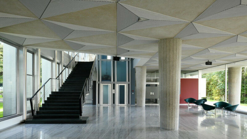 The entrance hall of Le Cedre. Claudio Merlini The headquarters of Vaudoise Insurance in Lausanne, designed by Swiss architect Jean Tschumi, is the subject of a detailed monument study to guide restoration work. The book's vernissage will take place on March 16 at 6 p.m. at the Musée cantonal de design et d'arts appliqués contemporains (MUDAC) in Lausanne. Architects Giulia Marino and Franz Graf are publishing the first comprehensive monograph on the building Le Cèdre, inaugurated in Lausanne in 1956 and designed by Swiss architect Jean Tschumi as the headquarters of Mutuelle Vaudoise Accidents. The researchers, who are with the Faculty of Natural, Architectural and Built Environment (ENAC), reviewed the history of the building at the request of the Canton of Vaud and the insurer itself to help contractors make the right decisions in future restoration work. Western facade, 2021. Claudio Merlini The site, Campagne du Cèdre, would have housed the Ecole polytechnique de l'Université de Lausanne (EPUL), the precursor of EPFL.