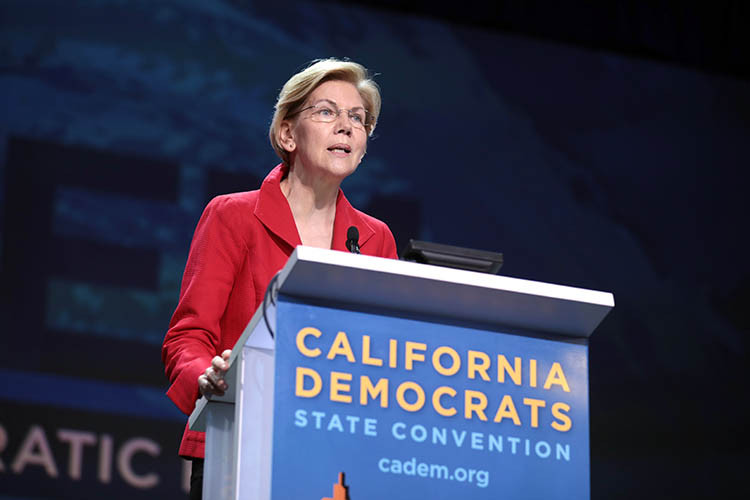 Elizabeth Warren spoke at California’s Democratic Convention in July 2019. She leads the pack of candidates, according to a new UC Berkeley poll. (Photo by Gage Skidmore, shared via Creative Commons 2.0)