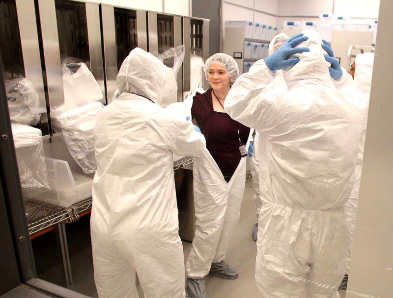 On Oct. 26, visitors toured the new imaging and fabrication facilities the Princeton Institute for the Science and Technology of Materials (PRISM) now housed in the Andlinger Center for Energy and the Environment. The new laboratories are open to researchers from outside of Princeton as well as to scientists across the University such as Caroline Krauter (center), a postdoctoral research fellow in mechanical and aerospace engineering. (Photo by Frank Wojciechowski, Office of Engineering Communications)