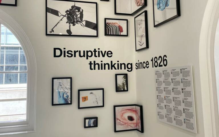 The interior of the North Lodge, displaying a selection of UCL research images and a sign ’Disruptive thinking since 1826’
