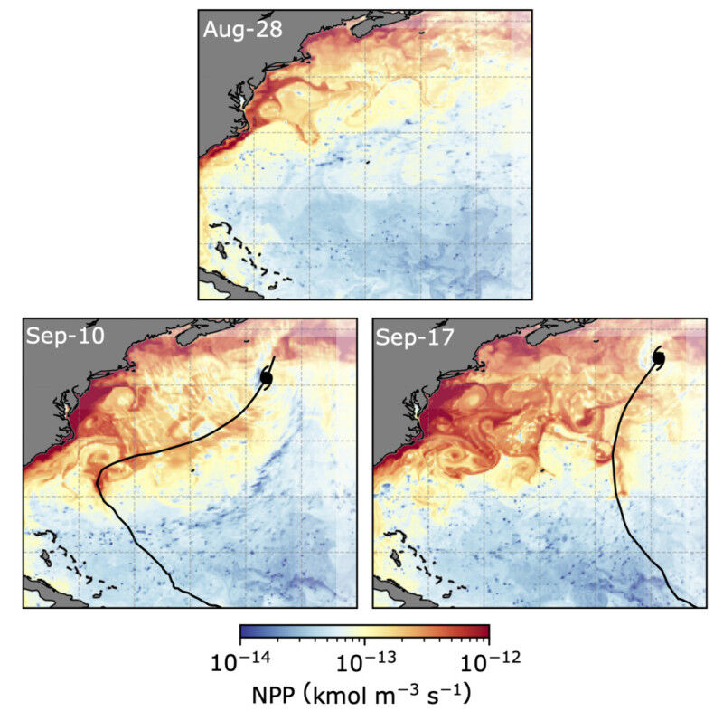Another striking effect of the hurricanes was how they induced mixing in the upper ocean, bringing nutrients to the surface. Phytoplankton growth increased tenfold in response. The bloom lasted for a few weeks after the passage of the hurricanes and was not restricted to their wake: Local currents, partially intensified by the storms, distributed the biomass across large parts of the western North Atlantic.