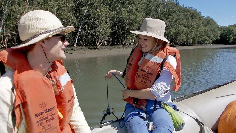 Olga Schmitz (right) and Paul Mehlhorn sampling the sediment of a lagoon in Richards Bay (South Africa). Image: Peter Frenzel (Universität Jena)