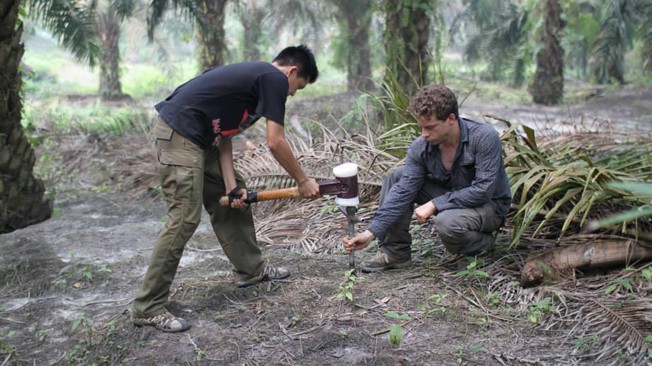 Thomas Guillaume (on the right) collecting samples in Sumatra, Indonesia.
