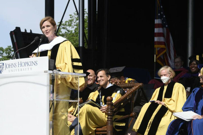 Samantha Power speaks at Commencement - Samantha Power urges graduates to 'focus on a calling, not a career' In Commencement address, USAID administrator encourages Class of 2022 to embrace uncertainty to discover 'life's most rewarding gifts' Commencement speaker Samantha Power challenged to the Johns Hopkins University Class of 2022 to be open to embracing new directions in life even if that means diverging from their intended career plans. Ron Daniels speaks at Commencement - In remarks to graduates at Homewood Field on Monday morning, Power-administrator of the U.S. Agency for International Development (USAID), former U.S. Ambassador to the United Nations, and a Pulitzer Prize-winning author-offered up her own backstory as an example, sharing that she aspired to be a professional athlete and then pivoted to sports broadcasting before seeing news coverage of college students her age protesting the Chinese government in Tiananmen Square in 1989. "I saw raw footage coming from Beijing that stopped me in my tracks and changed the trajectory of my life," Power said. "The plan I had to be a sportscaster suddenly felt inadequate to the challenges facing the world. I no longer had a career, but for the first time, I had something that I hadn't actually known I was missing-not a career path, but a real-world calling. I wanted to stand, if not literally in front of tanks, on the side of those fighting for their dignity and freedom." While we all crave certainty, Power said, it's an illusion.
