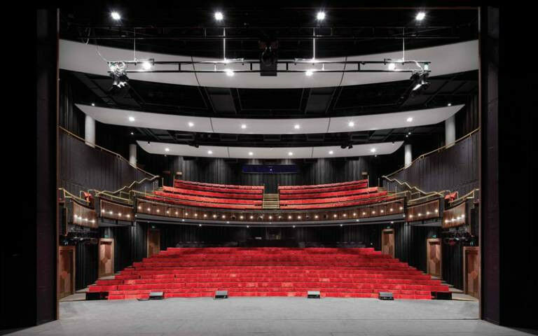 Image of the red velvet seats in the Bloomsbury Theatre, seen from the stage with stage lights illuminated