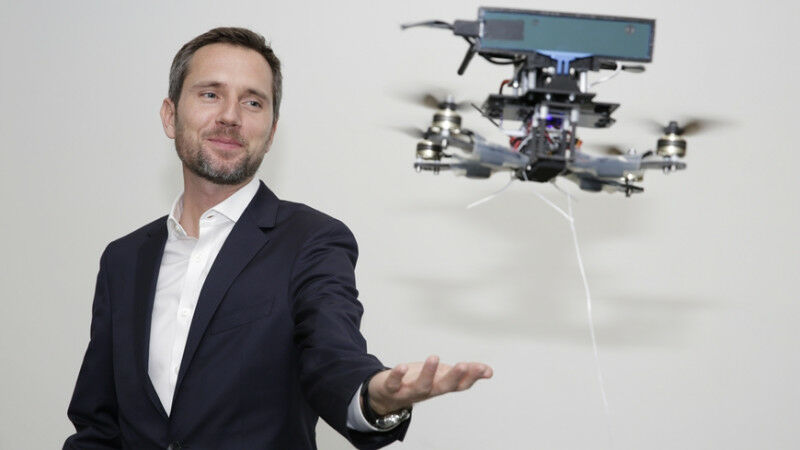 Mirko Kovac, pictured here with a different type of drone, is head of Empa’s Materials and Technology Center of Robotics and Director of the Aerial Robotics Laboratory at Imperial College London. Image: Imperial College London