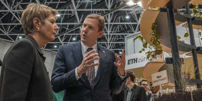 Federal Councillor Karin Keller-Sutter finds out from Christian Wolfrum, Vice President for Research at ETH Zurich, the business ideas behind the spin-offs at the Start-up Tower. (Photograph: smith-art / ETH Zurich) ETH Zurich is present at the Olma trade fair in St Gallen. Using spin-offs and games, the ETH booth illustrates how research can contribute to making Swiss food and agriculture sustainable. Yesterday, Federal Councillor Karin Keller-Sutter opened the 80thOlma trade fair. In her original and at times self-ironic speech, the Finance Minister made a literary digression into the importance of the pig and spun a narrative ranging from the supportive role played by the Olma piglet and the pig that plays a major role in her job as Finance Minister - the piggy bank - to the savings cuts earmarked for federal finances, from which even the agricultural budget is not to escape unscathed. She went on to state: "It is getting more crowded at the feeding trough." But what does that mean for agriculture? "Swiss agriculture has every reason to be confident," the Federal Councillor went on in an encouraging tone to the guests present. "I am convinced that its innovative capacity will enable it to seize future opportunities." Innovations for food and agriculture .