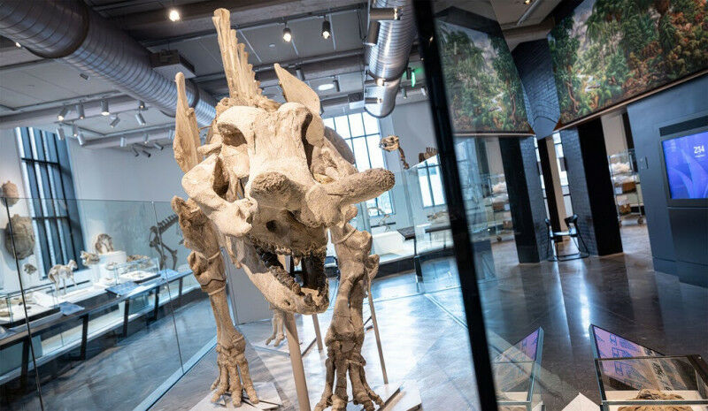 Megacerops, a hulking 'thunder beast' that once roamed present-day South Dakota, one of many refurbished fossil mounts on view at the renewed Peabody Museum. (Photo by Dan Renzetti) The beloved museum has been reimagined for the 21st century with bright new galleries, expanded classroom space, and compelling exhibits accessible to all. Following a transformative four-year renovation, the Yale Peabody Museum reopens to the public on Tuesday, March 26, at 10 a.m., with rejuvenated galleries, reimagined exhibits, and refurbished dinosaurs, including a towering Brontosaurus with some new pep to its step. Guests can pre-book visits on the Peabody's website. The museum will use a reservation system for the first 30 days after opening to manage anticipated crowds. The renewed Peabody - which now offers free admission for all visitors - is a dynamic center of participatory learning, groundbreaking research, and more accessible exhibitions that present the ever-changing story of life on Earth to a new generation of schoolchildren, university students, and museum-goers from New Haven, the region, and the world. A model of a male Pteranodon perches atop the welcome desk at the Peabody's main entrance.