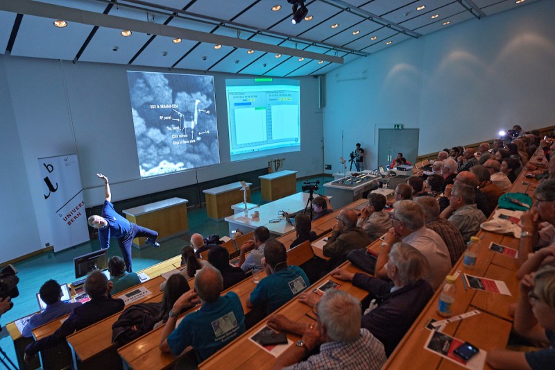 Nicolas Thomas of the Center for Space and Habitability (CSH) demonstrated how Rosetta’s Lander «Philae» is now lying on comet 67/P. The data of ROSINA sent during the descent was shown on the right. Photo: UniBE / Adrian Moser.
