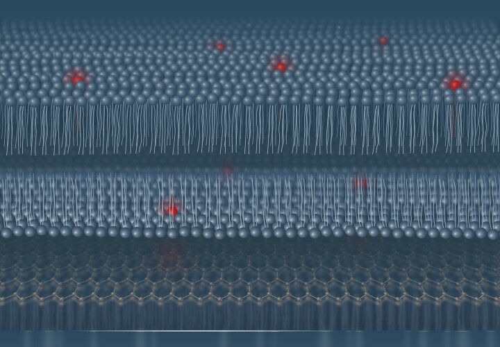 Artificial cell membrane with fluorescent molecules (red spheres) over a graphene layer (hexagonal grid) as used for smMIET (Single-molecule, metal-induced energy transfer) measurements. Photo: Dr Alexey Chizhik, University of Göttingen