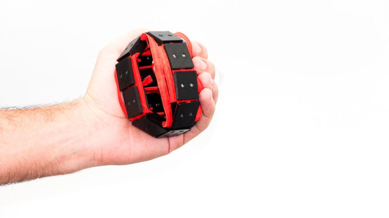 The Digits framework meets this challenge thanks to the signature reconfigurable robotics technology of Paik’s lab. Remarkably, it spans two major categories of robotic configuration: closed-chain and open-chain. While open-chain structures consist of series of connected links fixed at one end, like a robotic arm, closed-chain configurations usually have a loop design with two fixed ends. The open-chain TangiGlove therefore resembles an exoskeleton, which can be used to deliver stiffness feedback to the wearer. Meanwhile, the closed-chain TangiBall has four connected Digits that can assume up to eight different shapes - ranging from a cube to a sphere - in addition to providing stiffness feedback. Both devices can also produce vibrations.