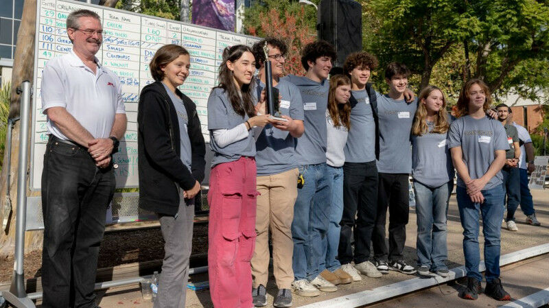 Oakwood School’s Team Pink won first place in the Invention Challenge at NASA’s Jet Propulsion Laboratory. Paul MacNeal (left) has run the competition since 1998.