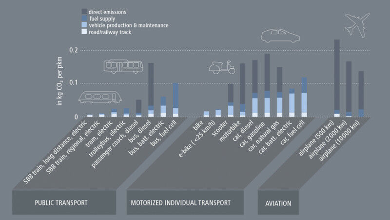 Life cycle greenhouse gas emissions for different passenger transport modes. Illustration: Empa