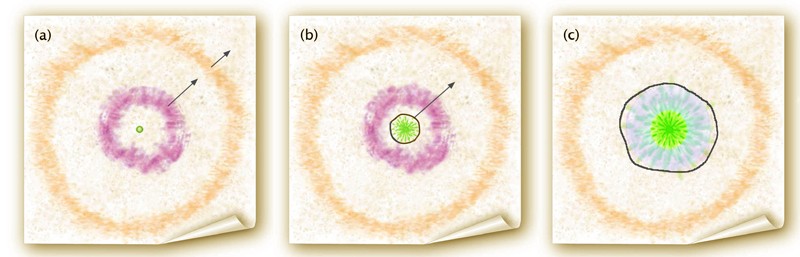 The day the supernova exploded (a) it was surrounded by a shell of matter ejected a month earlier (purple) with a radius of 7,000,000,000 kilometers, moving 2,000 kilometers a second. An outer shell (orange) had been ejected earlier and was moving slower. By day 5 (b) the shock front (black circle) was moving 10,000 kilometers a second, and by day 20 (c) had engulfed the inner shell, exposing the debris of the exploded core. (Sketch adapted from Ofek et al, Palomar Transient Factory)
