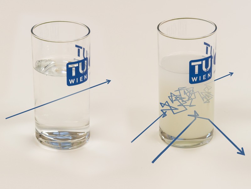 Licht auf dem Weg durch eine Flüssigkeit: Im Falle einer transparenten Flüssigkeit (links) sind Lichtpfade geradlinig. Im Falle einer Trübung durch Nanopartikel (rechts) werden Lichtpfade durch Streuung komplizierter. Manche der Pfade werden dadurch länger