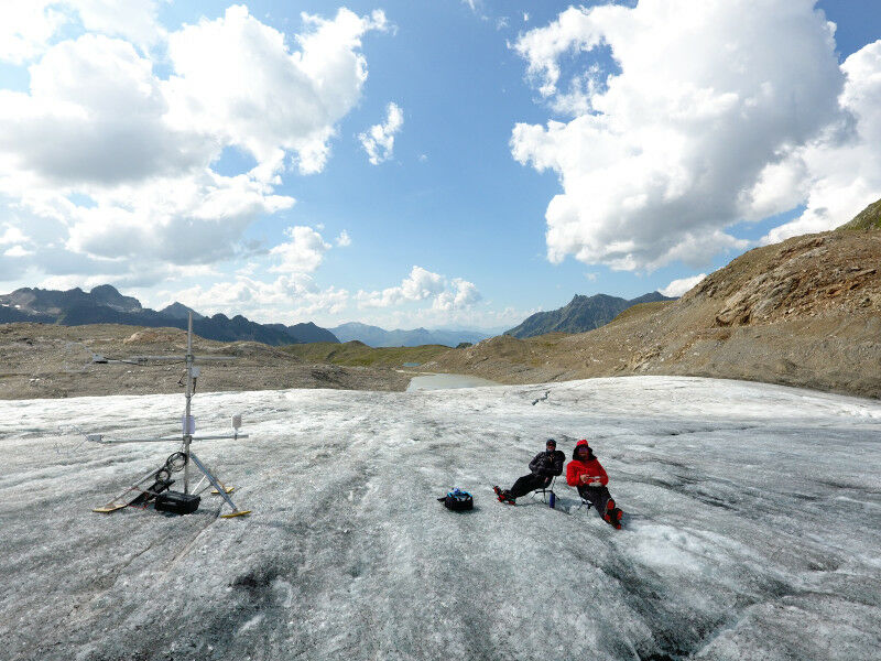 We are here for two weeks to study the microclimate of the glacier. During summer, it tends to be very characteristic: While the surrounding rock faces quickly heat up under the sun and subsequently heat the air around them, the cold, icy surface of the glacier cools the air above. The differences in temperature and pressure result in a cool, downwind - the "glacier wind", sometimes called "spirit of the glacier" by mountain communities - flowing downslope towards the tongue of the glacier. On one hand, this glacier wind helps keep the surface of the ice cool on hot summer days and thus slightly reduce glacier melt. On the other hand, an increase in mean air temperature over the years due to global climate change may increasingly disturb the glacier microclimate, for example because stronger warm winds erode the glacier wind from the side, potentially accelerating glacier melt even more.