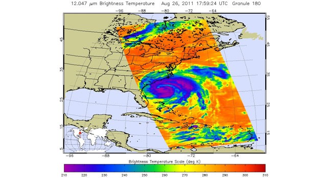 Infrared image of Hurricane Irene taken at 1:59 p.m. EDT (17:59 UTC) on Aug. 26, 2011 by the Atmospheric Infrared Sounder (AIRS) instrument on NASA’s Aqua spacecraft. Areas colored purple represent the storm’s coldest cloud-top temperatures and areas of heaviest precipitation.