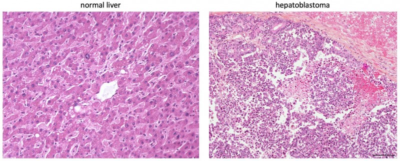Normal liver tissue (left) and tissue with hepatoblastoma (right)