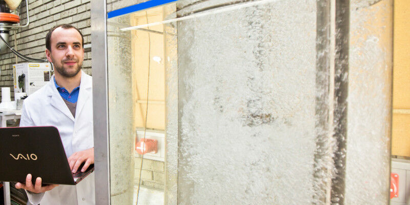 Christian Witz from the Institute for Process and Particle Technology at TU Graz in front of a Plexiglas model of a stirred and gassed (bio)reactor