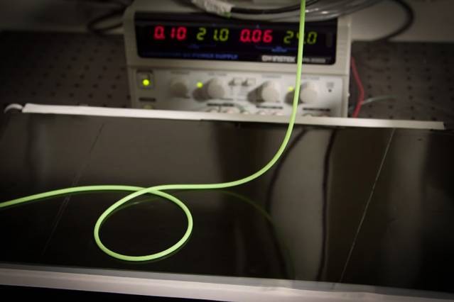 Desktop-scale experiment used to explore the various possible patterns obtained when a thin polymer rod (in green) is deployed onto a moving substrate (black conveyer belt). In this example, the rod forms a periodic array of loops in alternative directions.