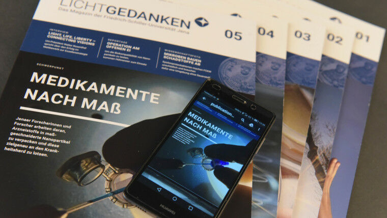 English-language edition of Jena University's research magazine LICHTGEDANKEN follows scientists in their search for tailor-made drugs and targeted therapies. Light Life Liberty Inflammatory diseases, infections, cancer: in 2019 there are still many conditions for which there are either no therapies or existing treatments are insufficient. The problem is often not a lack of active substances, but rather the difficulty of getting a drug precisely and efficiently to the location of the disease. The latest edition of Friedrich Schiller University's research magazine, LICHT GEDANKEN , focuses on 'Made-to-measure-medication', presenting projects and studies in which scientists in Jena are working to create more targeted therapies. The magazine reports, for example, on pioneering research to develop nanoparticles which not only package drugs securely, but can also transport them to the desired destination and release them there. The article takes the reader into a laboratory of Jena University's Institute of Pharmacy, where nanoparticles are tested for biocompatibility in an unusual chicken's egg model. In addition to this key topic, LICHT GEDANKEN again explores a wide variety of research projects.