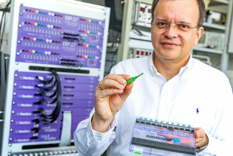 Professor Dr. Andrej Kral with a multi-electrode array in front of an amplifier for brain wave measurement; Copyright: Karin Kaiser / MHH