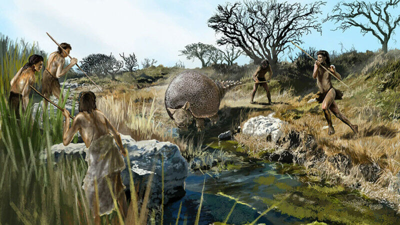 Prehistoric hunters surrounding a glyptodont. The remains of glyptodonts, a group of extinct giant armadillos, indicate that humans spread to South America earlier than previously assumed. Found in northwestern Venezuela, the fractured skulls could represent evidence of hunting by humans, says UZH paleontologist Marcelo Sánchez. Skilled human hunters are also likely to have contributed to pushing the large, heavily armored animals over the brink. Stefan Stöcklin Northern Venezuela must have been a paradise for flora and fauna. Some 18,000 years ago, mighty mastodons would trudge across the humid landscape, with giant snakes slithering through the jungle and huge sloths slowly moving about in the treetops. A glyptodont would quench its thirst at a watering hole and then retreat into the shade - and suddenly find itself surrounded by a group of humans, armed with spears and clubs.