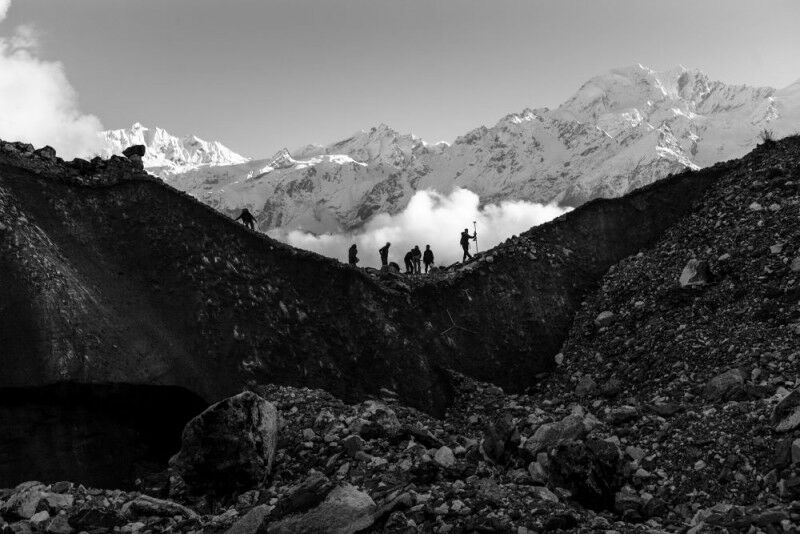 Daten direkt aus der Landschaft: Forscher:innen platzieren strategisch Equipment und Sensoren auf dem schuttbedeckten Gletscher.