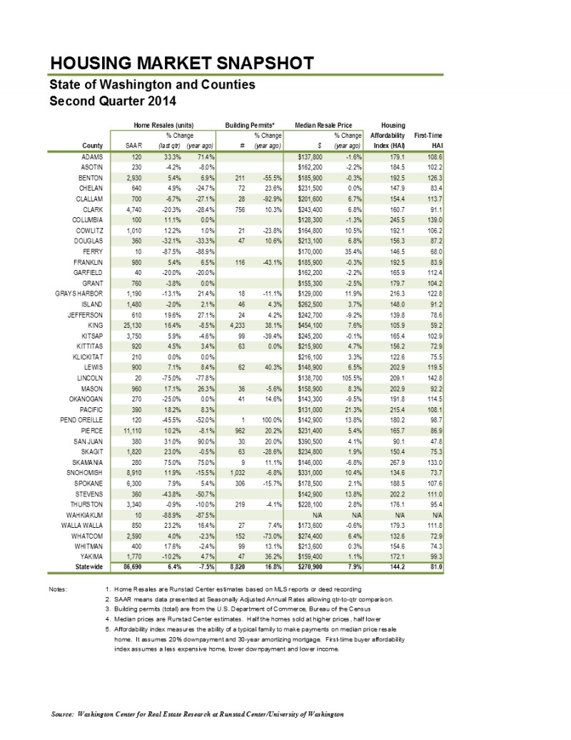 University of Washington - Washington state's housing market rebounded from its first quarter performance, as the annual rate of existing home sales rose 6.4 percent in the second quarter of 2014. While the increase from the first to the second quarter is notable, year-over-year sales activity is still down across the state, according to the second quarter housing report from the Runstad Center for Real Estate Studies at the University of Washington. As measured on a seasonally adjusted basis, the home sales are on pace to total about 86,690 for the 2014 calendar year. "While most economic statistics are reported at seasonally adjusted annual rates, these are not forecasts of future activity,” said Stephen O'Connor, Runstad Center director. "Nevertheless, at the current pace of sales we're looking at a 7.5 percent decline in sales activity from the second quarter in 2013. Statewide, the median home sales price increased 7.9 percent from the same time last year and now stands at $270,900, up nearly 9 percent from the first quarter. While the transition from the winter to the spring selling season is almost always a contributing factor, so is the lingering lack of supply, O'Connor said.