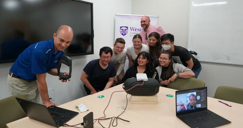 Dr. Adam Sirek sets up a holographic teleportation with ( bottom row ) Alex Zhou, Hira Nadeem, Paula Bosca, ( middle row ) , Adam Levschuk, Jocelyn Whittal, Sara Mohamed, Jin Sing Sa, and ( Top ) Douglas Keddy. (Darryl Lahteenmaa / Western Communications) - Holographic teleportation sounds like something out of Star Wars or Star Trek , but instead of the bridge of a flashy interstellar spaceship, a futuristic technological achievement took place in a nondescript boardroom on campus at Western recently. The term holographic teleportation, or holoport, is a combination of hologram and teleport: when a hologram of a person or object is transmitted instantaneously to another location. On the afternoon of July 27, a small group of students from the Western Institute for Space Exploration (Western Space) gathered to witness and take part in what they believe to be the first international holoport demonstration. "We had the incredible opportunity to demonstrate the first international, two-way holographic teleportation," said project leader Leap Biosystem's co-founder, Dr. Adam Sirek, a faculty member at the Schulich School of Medicine Dentistry, and Western Space. In April, NASA successfully holoported a doctor on to the International Space Station (ISS), becoming the first "holonaut," but last Thursday's Western Space demonstration was the first time anyone has crossed international borders through holographic teleportation. ">http:// "We transported one person from Alabama to London, Ontario, and then each of the students here on the project were able to instantly holoport themselves in holographic form down to Huntsville, Alabama," Sirek said.