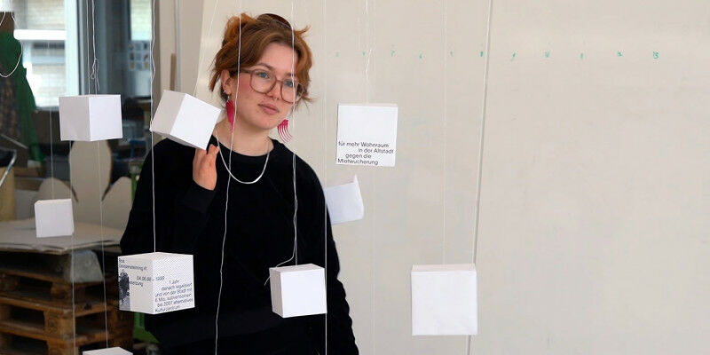 After years of diligence, the crowning glory follows: the final exhibition of the design, film and art students. This year, for the first time, the diploma theses from two new fields of study are also on display: Data Design & Art and Spatial Design. public exhibition June 23 to July 2, 2022 Werkschau Design & Kunst 2023 In March 1981, young people occupied the former hotel-restaurant "Einhorn" in downtown Lucerne, which was vacant at the time. With this action, the young men and women protested for more affordable housing, marking the birth of Lucerne's squatter scene. Without the "Unicorn" squat, Stéphanie Kiser's final project at the Lucerne University of Applied Sciences and Arts would probably not exist: Kiser is studying for a Bachelor's degree in Data Design & Art. In her work "Hier wohnen wir!" (This is where we live!), she presents the history of Lucerne squats since 1981 in a three-dimensional, walk-in data installation. The native of Aargau wants to convey to the audience in a catchy way in which periods and in which places squatting occurred particularly often.